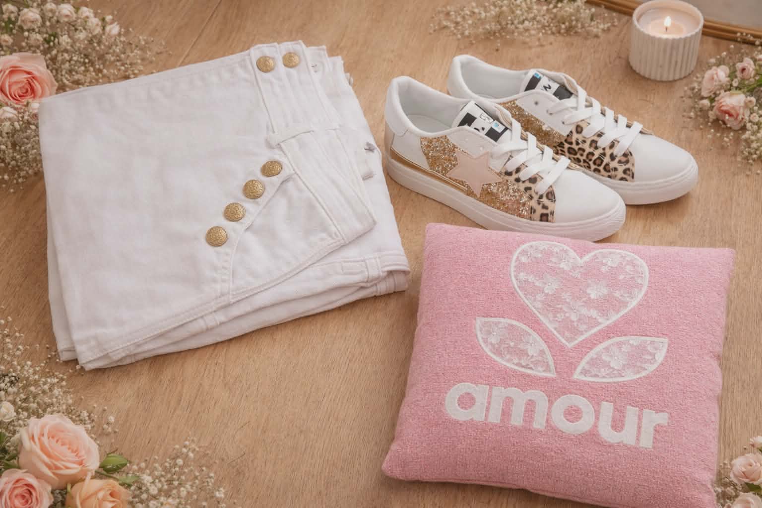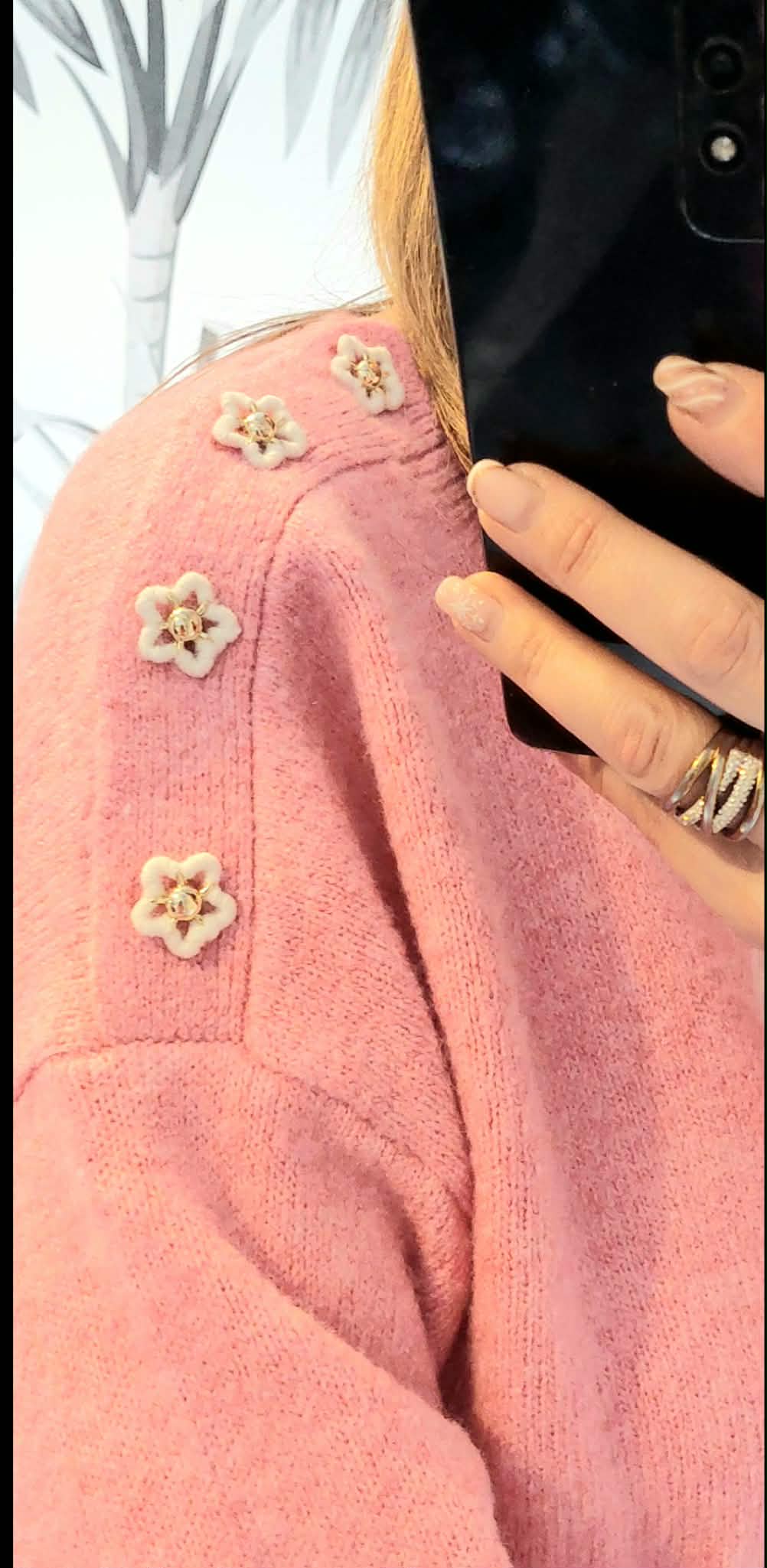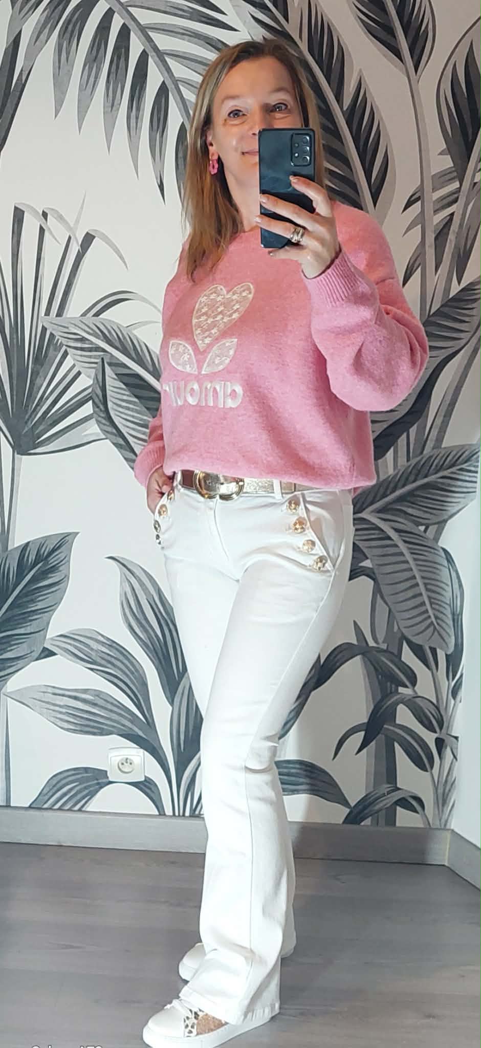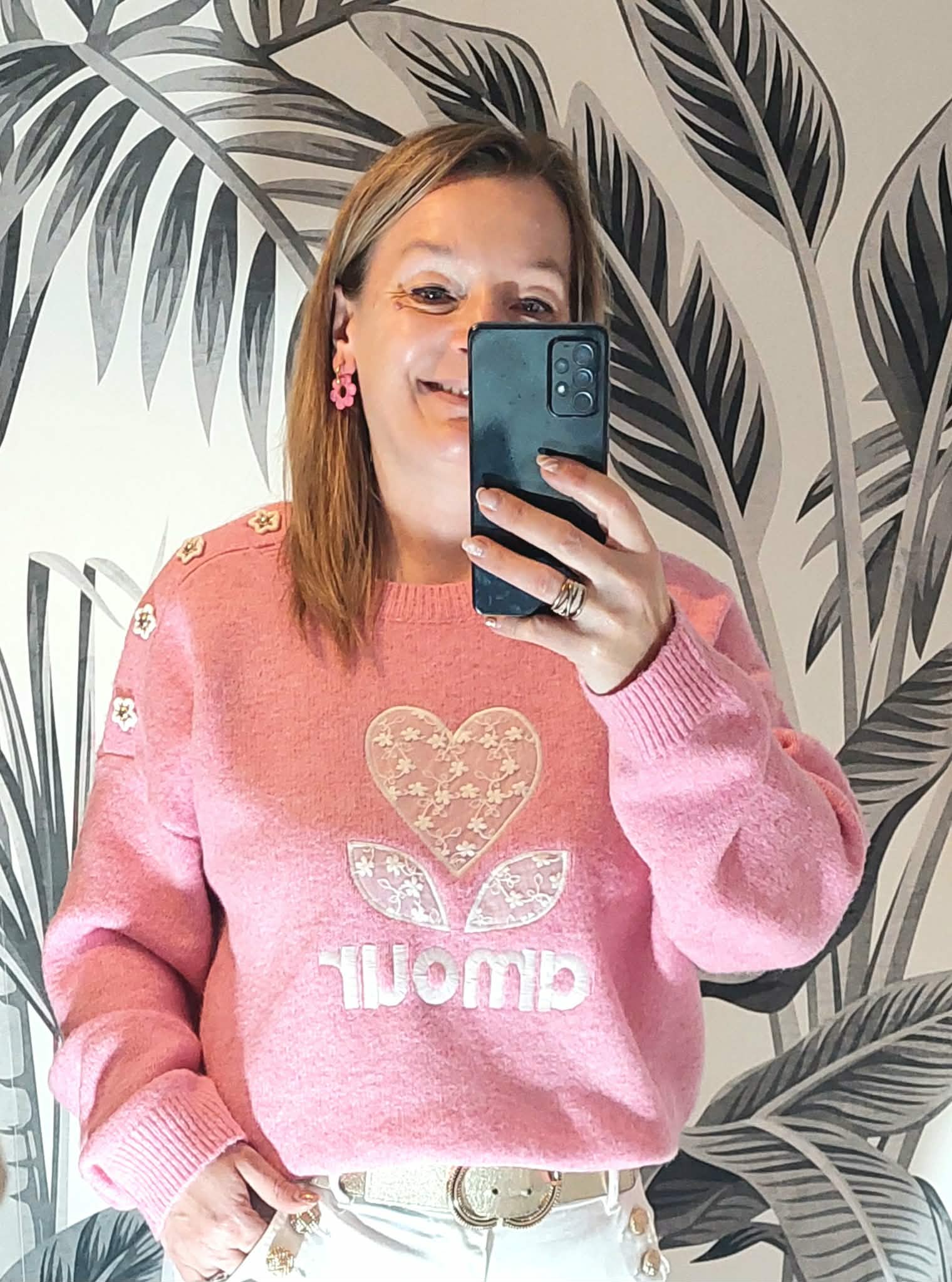Pull amour Très doux, détail brodé sur l’épaule , col rond, avec broderie blanche Amour