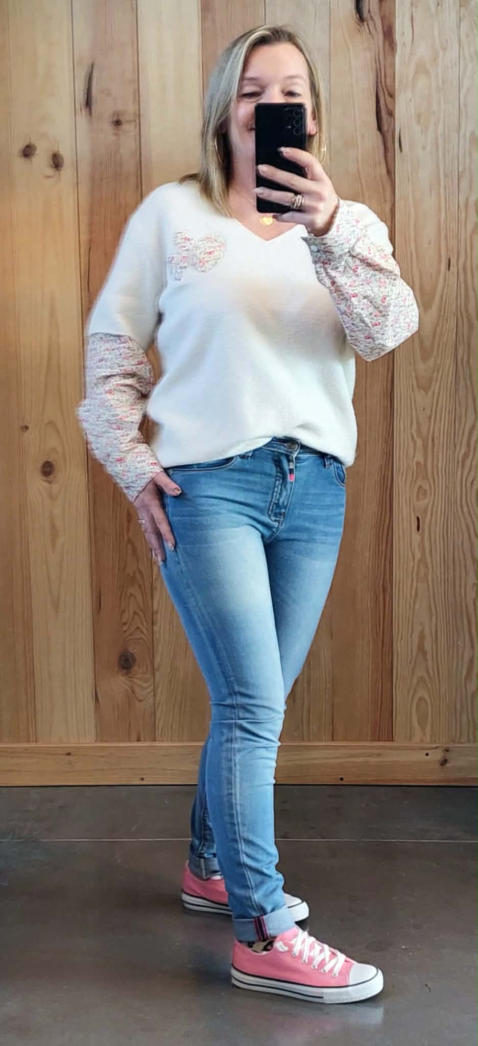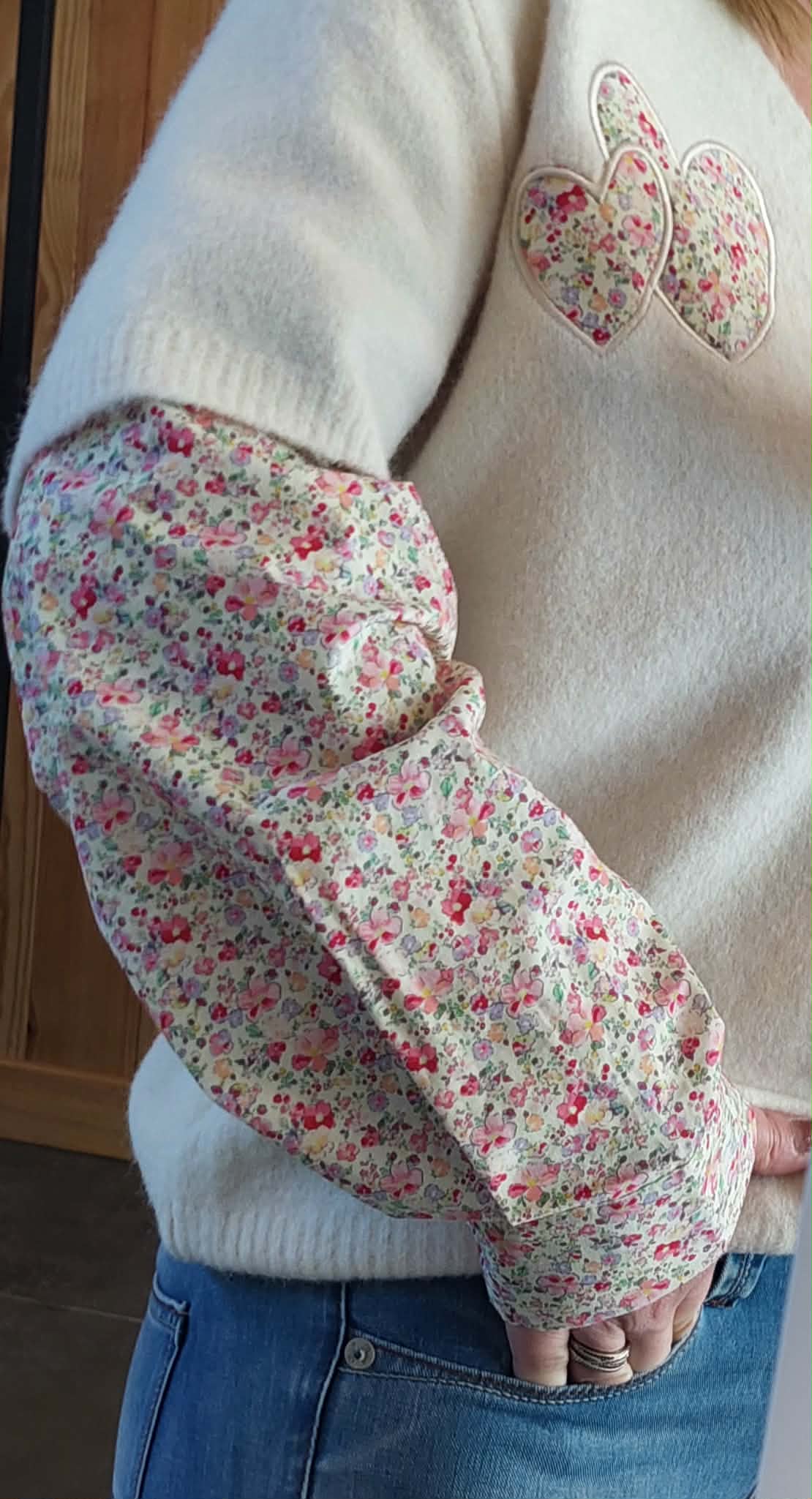Adoptez le look 2-en-1 avec notre pull coeur ! poignets chemise floral intégrés pour un style chic sans effort. Qualité doudou, choppez votre pépite ! col en v