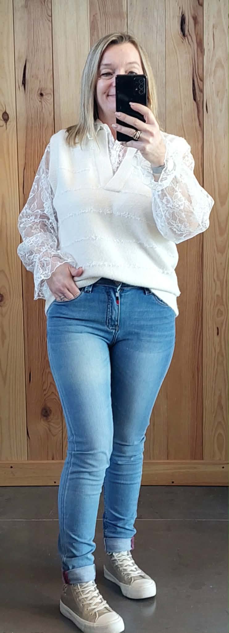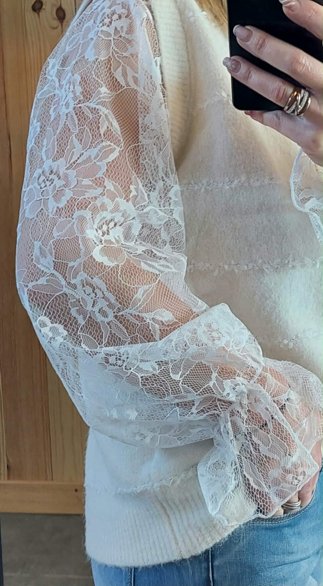 Apportez une touche de lumière et de féminité à votre tenue avec ce pull jaune pour femme orné de magnifiques détails en dentelle sur les manches col chemise en dentelle.