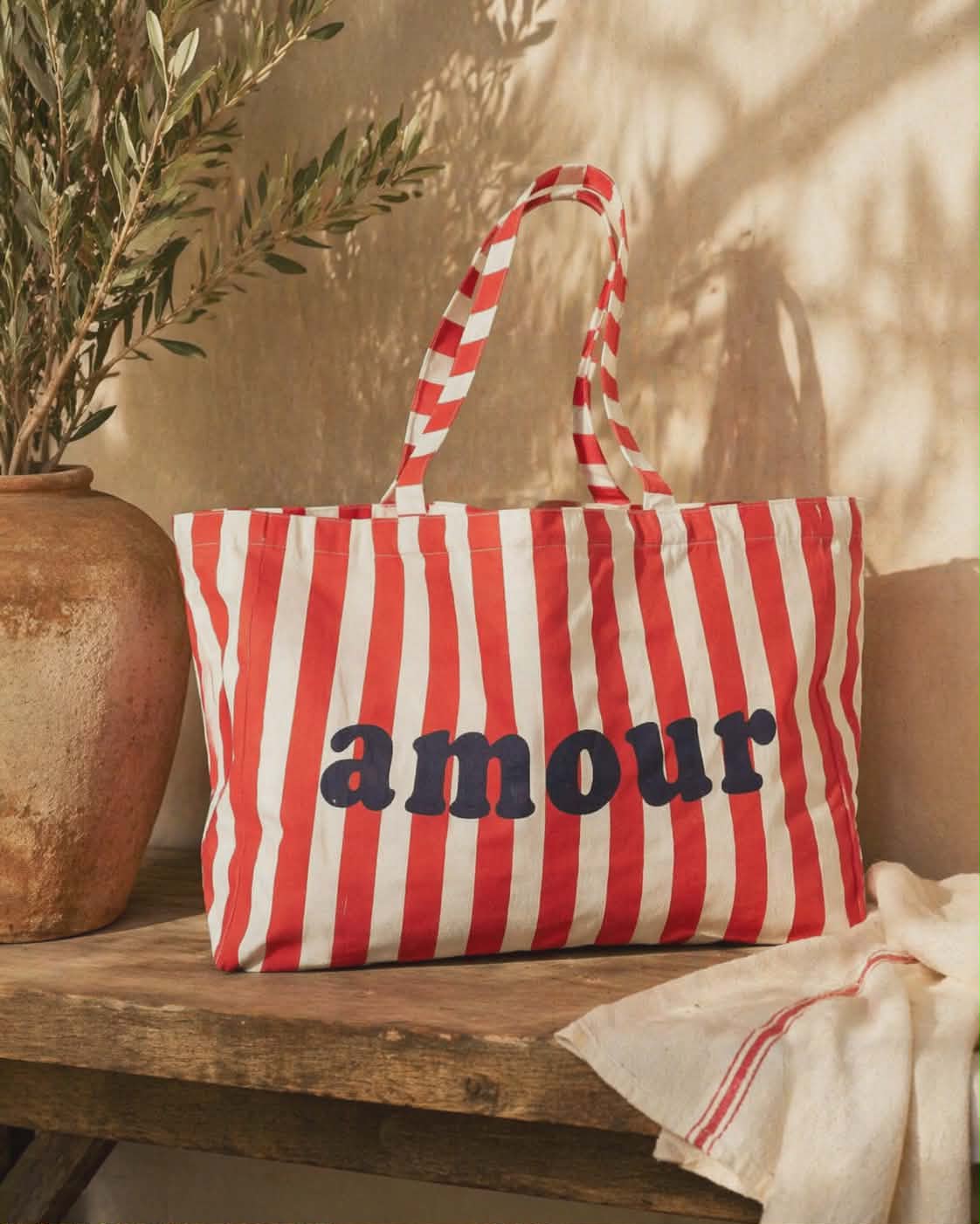 Avec ses jolies rayures intemporelles et son message plein de douceur, le cabas Amour apporte instantanément du style a toutes vos tenues.
